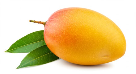 fresh indian organic ripe yellow mango fruit with leaves closeup isolated, known in india various name as totapuri, kesar, amrapali or alphonso mango, white background with copy space