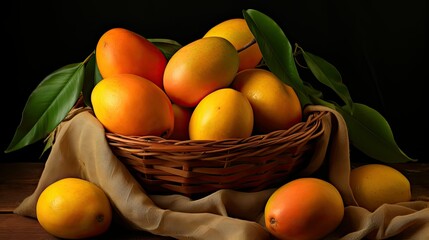 Mangoes tropical fruit in wooden basket on green leaf background just harvest from organic farm
