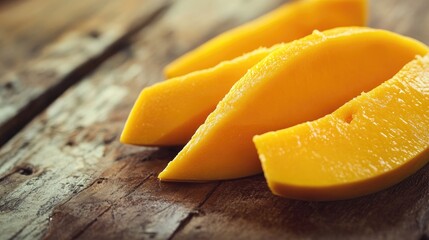 Alphonso mango slices on a wooden surface captured with selective focus