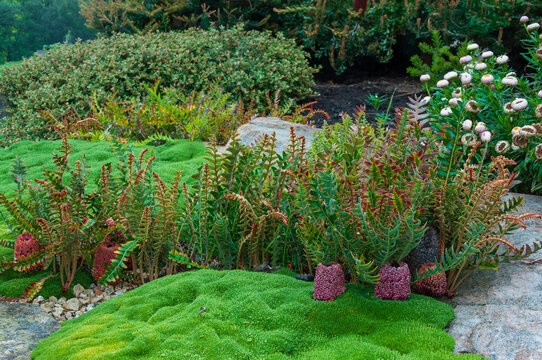 Banksia blechnifolia with flowers and leaves in garden bed. This native Australian plant features vibrant blooms and foliage, set against a backdrop of other shrubs on a cloudy day.
