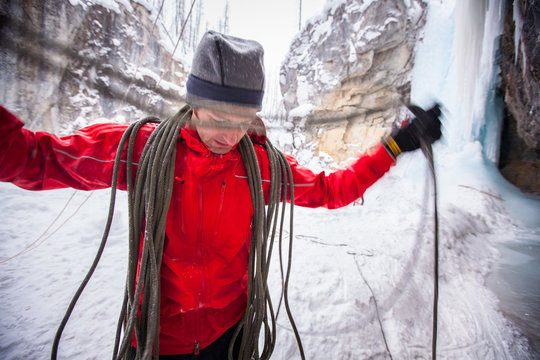 A man  flakes a rope after climbing at Haffner Creek, a cragging area for ice and mixed climbing near Banff, Alberta.