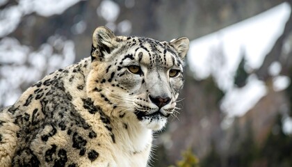 Snow leopard gazes intensely, blending into snowy, mountainous backdrop