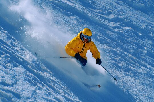 Skier in dynamic motion charges down a crisp alpine slope, blending colorful gear with pure winter excitement and outdoor freedom.