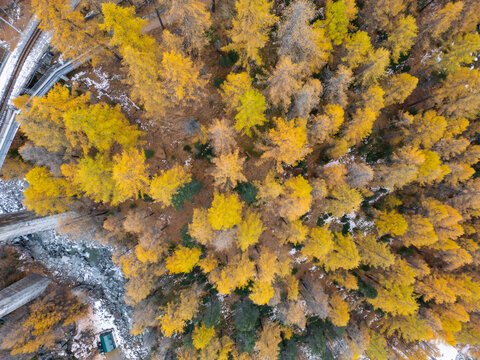 Solitary evergreen standing on sunlit snowy ridge with alpine peaks and winding tracks