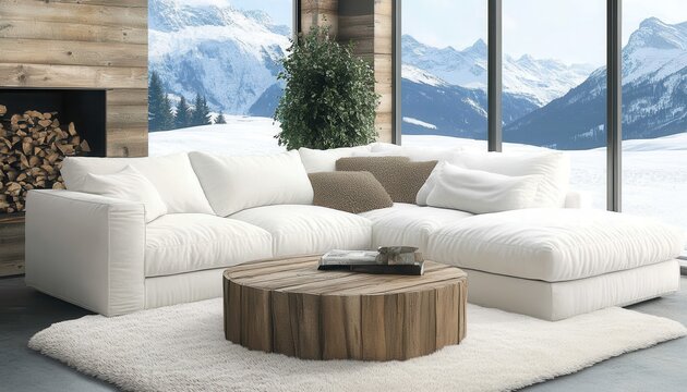 Cozy alpine living room with wooden beams and scenic mountain view in a modern chalet retreat during winter season