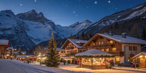 Christmas market in alpine village at night with snowy mountains cozy chalets and festive lights.