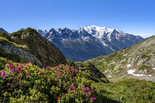 Mountain panorama with blooming alpine roses and glaciated mountain peaks, Aiguille du Midi and Mont Blanc, Aiguille de Mesure and Aiguille de Chamois, hiking in the Aiguilles Rouges, Chamonix, Haute-Savoie, France
