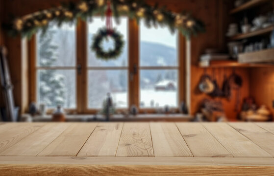 Empty wooden table with copy space for product placement in cozy alpine kitchen interior and window overlooking snowy trees and winter landscape. Seasonal advertising, home comfort, winter holidays.