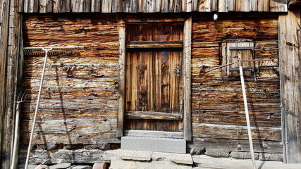 Traditional wooden mountain hut in the Austrian Alps with old rake and pitchfork. Lech, Arlberg, Austria.
