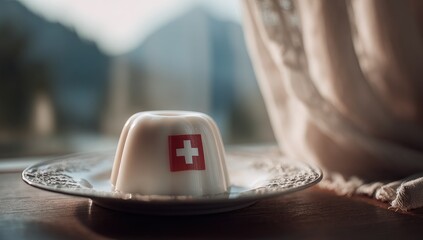 Creamy Swiss dessert on a plate, mountain view