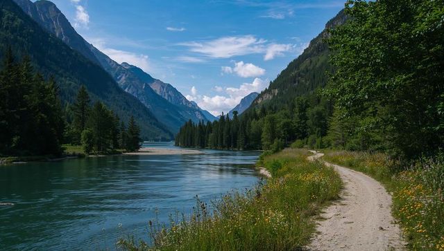 Winding Gravel Road through Lush Green Meadow and Mountain View