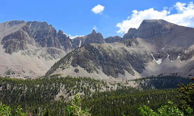picturesque  wheeler peak, pyramid peak, and jeff davis peak on a sunny  summer day  along the alpine lakes loop trail in great basin national park near baker, nevada