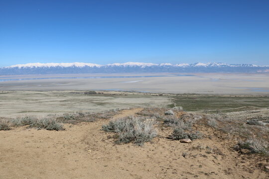 Looking down at Antelope Island, Great Salt Lake and Wasatch mountains from Sentry Loop trail