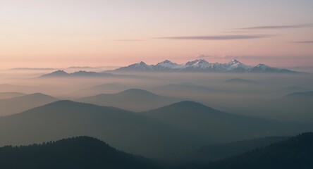 Snowy alpine mountains at dawn with soft pink glow