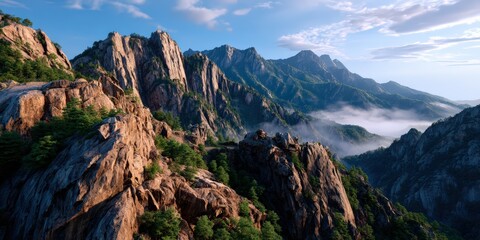 Majestic Mountain Range with Forest and Cloud Layers