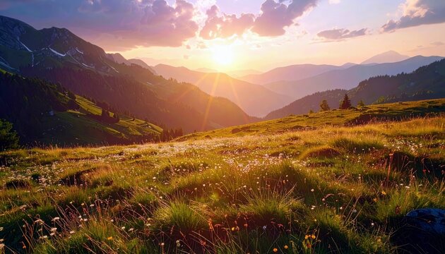 A breathtaking sunset illuminates a lush green mountain meadow dotted with wildflowers, with layers of distant mountain ranges fading into the horizon.