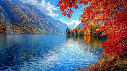 Vibrant autumn scenery of a serene alpine lake reflecting the surrounding majestic mountains and colorful fall foliage