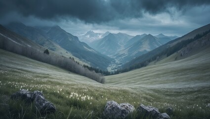 Breathtaking alpine mountain landscape with vast green valleys