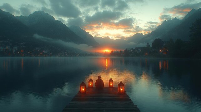 Serene Sunset over Mountain Lake with Lanterns on a Dock
