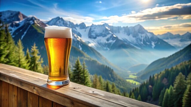 Full pint of beer on alpine lodge ledge