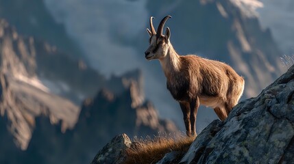 Majestic chamois standing on rocky mountain ledge against dramatic alpine landscape, showcasing wildlife in natural habitat.