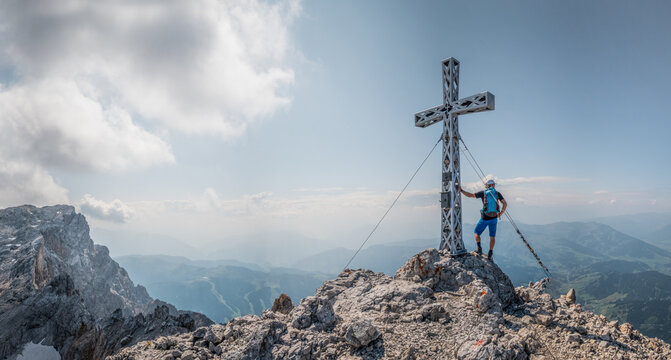 Man on a mountain top with arms up in triumph facing a stunning alpine panoramic view. Great metaphor for reaching a big goal, personal achievement, overcoming challenges, business success, freedom.