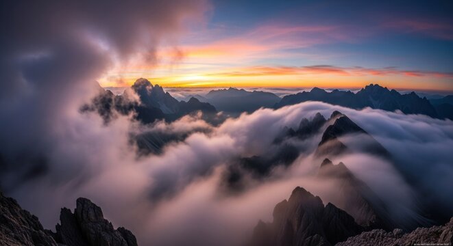 Ethereal Alpine Sunset: A River of Clouds Flows Through Majestic Mountain Peaks