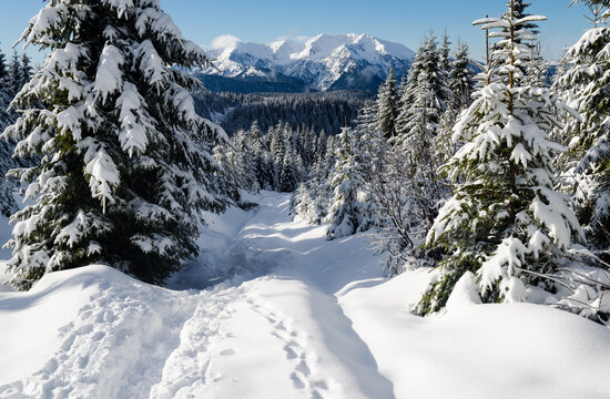 Sunrise illuminating snowy alpine valley with misty granite cliffs and frosted pine forest