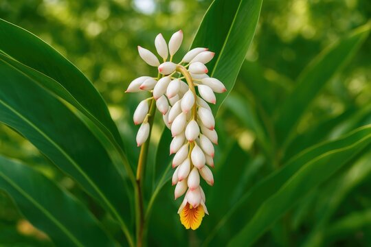 Flowering alpinia zerumbet plant in Florida zoological garden, closeup