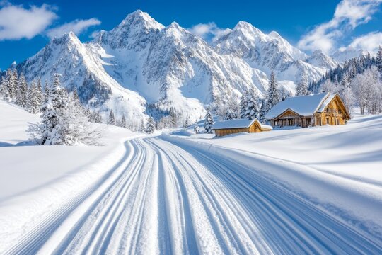 A winter scene in Alta Ski Area, with pristine snow covering the slopes and cozy chalets in the background