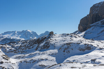 Die Kostnerhütte oder Rifugio Franz Kostner al Vallon in der Sella Gruppe im Skigebiet von Alta Badia und die Marmolada in den Dolomiten, Italien, im Winter