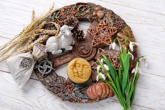 Wiccan altar for Imbolc sabbat. pagan festive ritual. Brigid's cross amulet, sun-moon symbol, wheel of the year, snowdrops, toy lamb on wooden table. Imbolc holiday, spring equinox. top view. close up