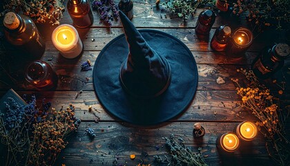 Overhead view of a pagan altar prepared for a magical ritual with a witch hat, candles and herbs