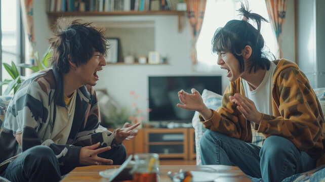 リビングルームで激しい言い争いをする日本人の友人