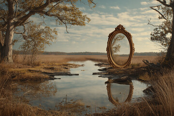 magician stands before grand ornate mirror in surreal setting His reflection shows alternate version, challenging viewer's perception of reality and selfhood