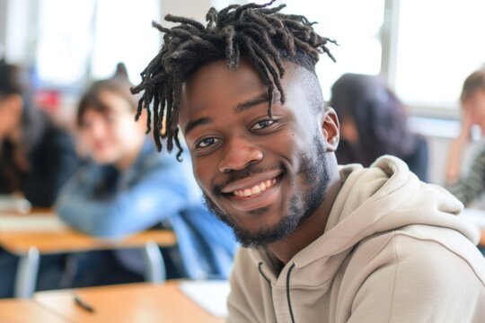 A man with dreadlocks sitting in a classroom, perfect for education or diversity-related concepts