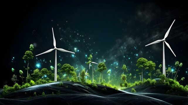 Green energy and the eco-global-planet idea with digitally illuminated windmills on an abstract, black backdrop with brilliant spots