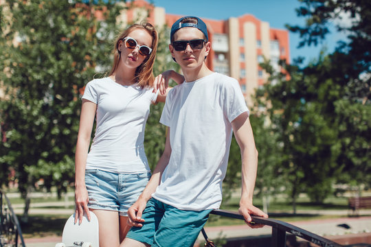 Young skater boy and girl with skateboard in white T-shirts on the street. Mock up.