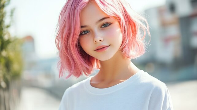 A person with pink hair posing for a photo shoot