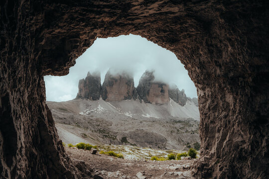 Three Peaks of Lavaredo Framed by Mountain Cave, Italian Alps