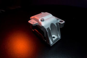 Engine mount. Metal frame, aluminum, resonant part pressed into it. For damping engine vibrations. Spare part. Close-up.