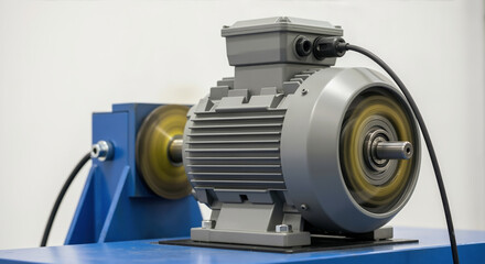 Industrial electric motor with shaft and mounting bracket on blue table. Manufacturing equipment for machinery automation and production line systems
