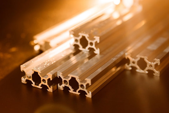 v slot aluminum profile lies on a black table, work surface with a bright lantern. how to assemble a cnc machine do it yourself.