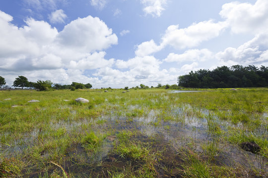 A vibrant nature alvar landscape with a winding path through the shallow soils