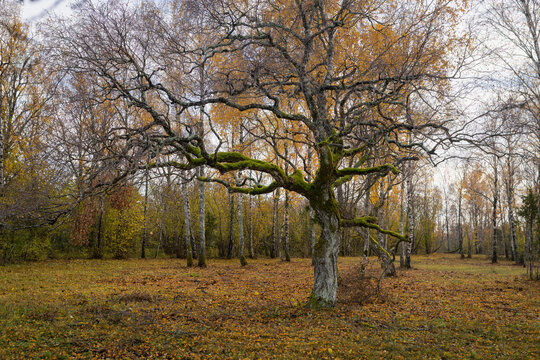 Silver Birch (Betula pedula) covered in crustose lichens and mosses growing on branches. An Old Silver Birch in autumn, betula pendula. Woodland in autumn.