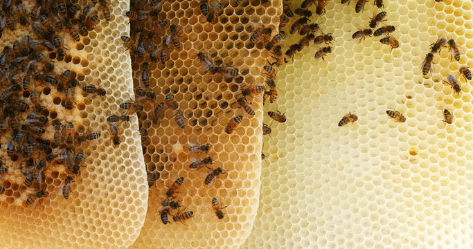 |European Honey Bee, apis mellifera, Bees on a wild Ray, Bees working on Alveolus, Wild Bee Hive in Normandy