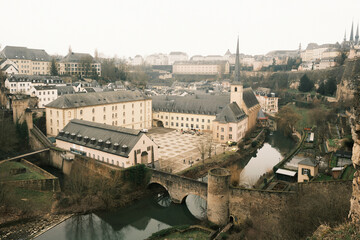 view over valley of river alzette in central luxembourg which is surrounded by many typical buildings and neumunster abbey.