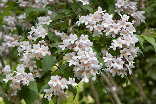 Kolkwitzia amabilis.Blooming Pink Flowers in Natural Setting.Pink Kolkwitzia bells.Blooming Pink Flowers with Green Foliage.Pink Flowers in Garden Setting