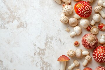 A collection of Amanita muscaria mushrooms of various sizes is scattered on a light textured background, creating a natural composition