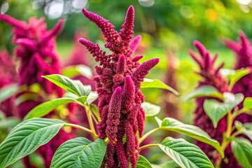 Indian red amaranth plant growing in summer garden. Leaf vegetable, cereal and ornamental plant, source of proteins and amino acids